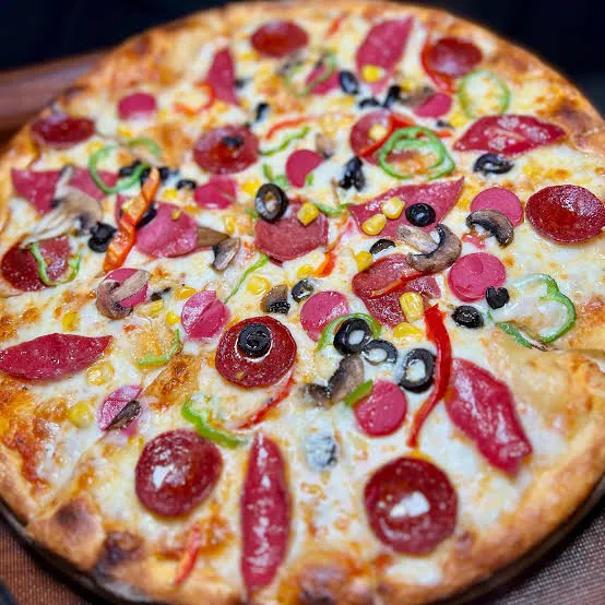 Mozzarella peyniri, sucuk, salam, jambon, yeşil biber, kırmızı biber, mantar